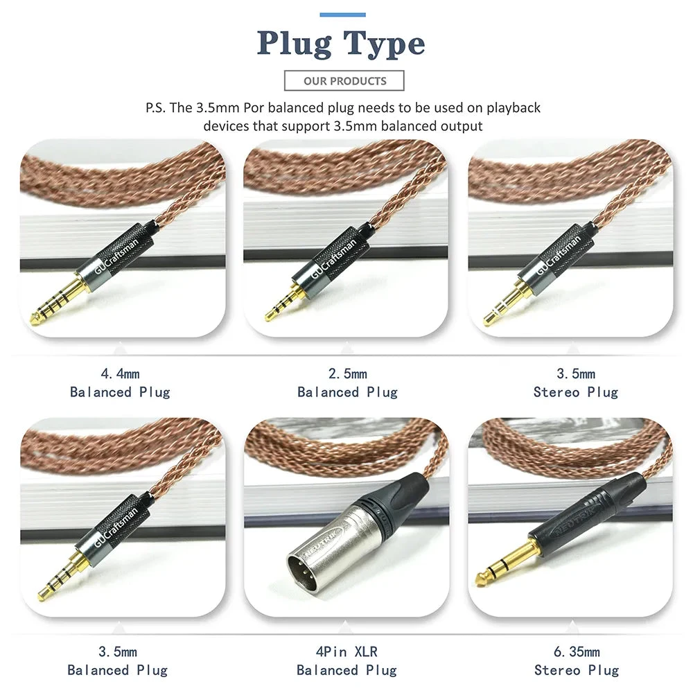 GUCraftsman 6N Single Crystal Copper Headphone Cables For Audio-technica ATH-ADX5000 MSR7B ESW950 ESW990H ES770H AP2000Ti A2DC